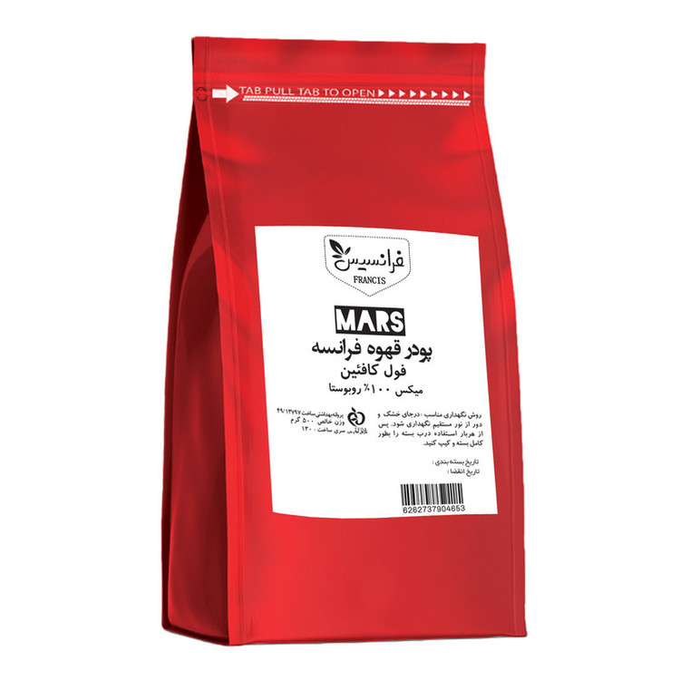 پودر قهوه فرانسه فرانسیس مدل مارس اینبار بنا به تقاضای شما مصرفکنندگان عزیز در بسته بندی 500 گرمی و از ترکیب 100 درصدی انواع دانههای روبوستا تهیه شده است. پودر قهوه فرانسه فرانسیس در طی مراحل کاملا بهداشتی و با نظارت متخصصین تولید و کنترل کیفیت و نظارت بهداشتی تولید شده است. در تهیه این پودر قهوه تنها از دانههای با گرید A , AA و سوپریور استفاده شده است. برای استفاه در انواع دستگاههای فرنچ پرس، قهوه ساز percolator، کمکس، کلد برو، پوراور و آیروپرس مناسب است. طعم آن یادآور شکلات و بادام تلخ است، تلخ و سنگین. بیشترین قابلیت چربیسوزی در بین قهوهها را دارد. کافئین بیشتر در این قهوه باعث هوشیاری بیشتر و افزایش تمرکز قویتری میشود. پرکافئین مخصوص ورزشکاران است. قهوه اسپرسو فرانسیس مدل مرکوری، کاملا بهداشتی با رست مدیوم-دارک است. اگر بخواهیم بین قهوههای تجاری به ویژگیهای آن امتیاز بدهیم باید اینطور در نظر گرفت که کافئین 10 از 10، غلظت 10 از 10، تلخی 8 از 10 و ترشیای برابر 1 از 10 دارد. اوریجین دانههای استفاده شده در پودر قهوه فرانسه فرانسیس مدل مارس ویتنام، اندونزی و هند است. از خواص مصرف با قاعدهی قهوه میتوان به موارد زیر اشاره کرد. پایین آوردن شانس سیروز کبدی ناشی از الکل، کاهش ریسک سرطان پوست، ضد افسردگی و شادیآور (با ترشح دوپامین)، کاهش ریسک حمله عصبی و اضطراب، کاهش احتمال ابتلا به بیماری پارکینسون، سرشار از آنتیاکسیدان، کاهش ابتلا به سرطان روده بزرگ در بانوان، کاهش ریسک ابتلا به دیابت نوع 2 (درمان نمیکند)، کاهش دردهای عضلانی در بانوان، ضد التهاب، تقویت حافظه کوتاه مدت، احتمال جلوگیری از دست دادن حافظه بلند مدت در بانوان.