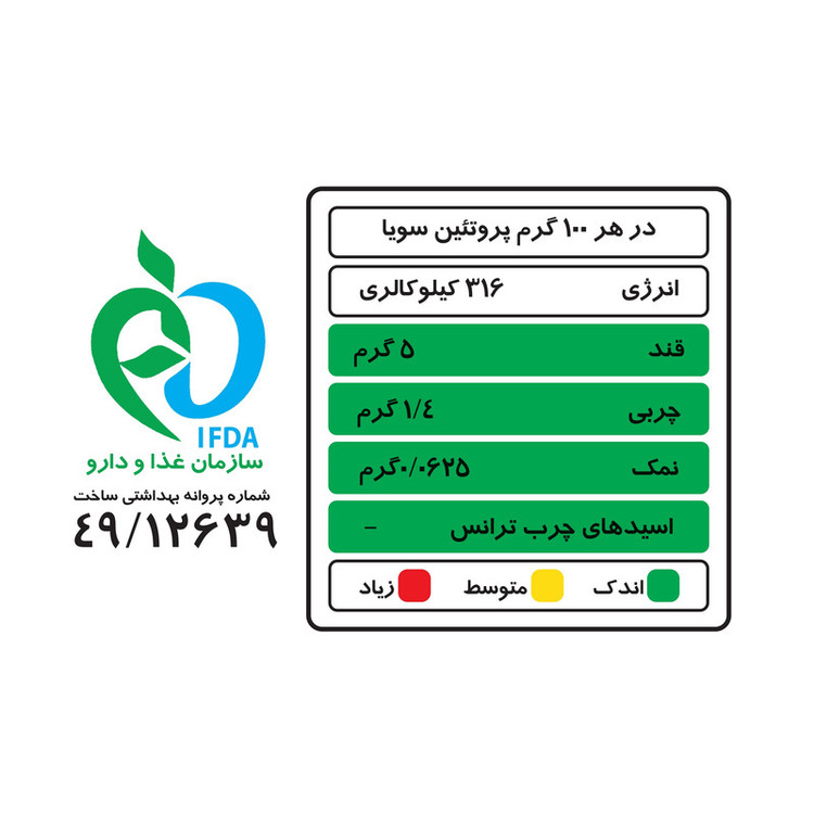 سویا مخصوص جمع با سایز متوسط از کنستانتره بهترین پروتئین سویا تهیه شده است. کلیه مراحل تولید این محصول مانند تهیه مواد اولیه، پاک کردن، غربالگری و بستهبندی تحت نظارت کامل متخصصین تولید و کنترل کیفیت و کنترل بهداشتی انجام شده است. پروتئین سویا بهعنوان بهترین و باکیفیتترین پروتئین گیاهی دنیا شناخته شده و حاوی 9 آمینواسید ضروری مورد نیاز بدن در طول روز است.
